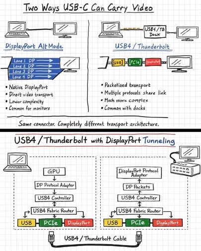 Bij de eerste methode wordt het videosignaal rechtstreeks als native DisplayPort over USB-C verstuurd. Bij de tweede methode wordt DisplayPort eerst verpakt in datapakketten en vervolgens via een USB4- of Thunderbolt-fabric getunneld. Dat lijkt meer op een netwerkswitch die verschillende soorten verkeer over dezelfde verbinding stuurt.